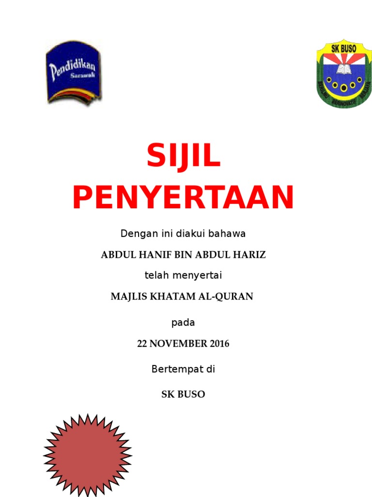 Contoh Sijil Untuk Majlis Khatam Aluran
